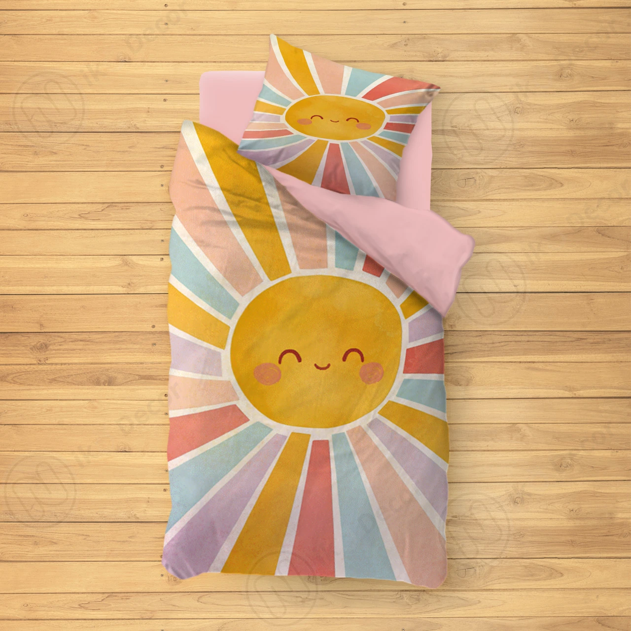 رویه لحاف، کاور بالشت و گادرها طرح چاپی خورشید رنگین کمانی دارند. ملحفه کشدوز، پشت لحاف و پشت کاور بالشت پارچه تکرنگ ساده میباشند.